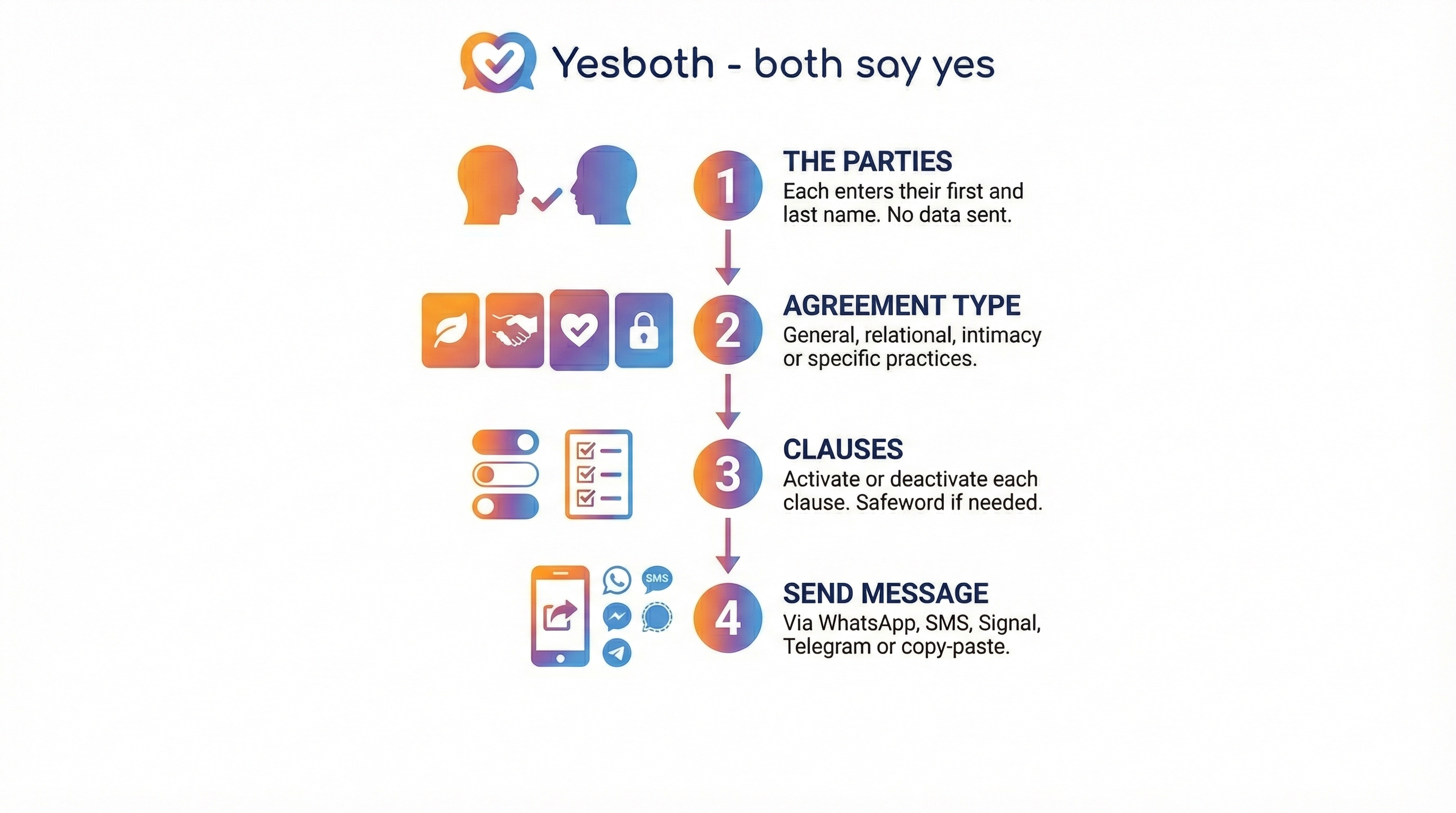 YesBoth est un outil gratuit et 100% local pour générer des messages de consentement clairs entre adultes. Aucune donnée ne quitte votre appareil.